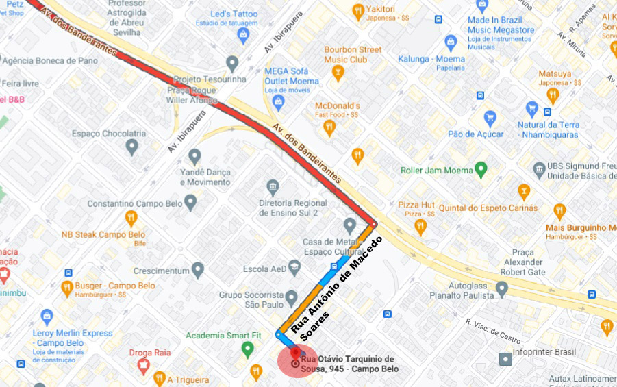 Seguindo pela Av. dos Bandeirantes sentido Imigrantes, depois de cruzar a avenida santo amaro e a avenida ibirapuera, permaneça a sua direita, no próximo semaforo, vire a direita na rua antonio macedo de soares, siga até a rotatória e entre sua esquerda na rua Rua Otávio Tarquínio de Sousa e siga até o número 945.